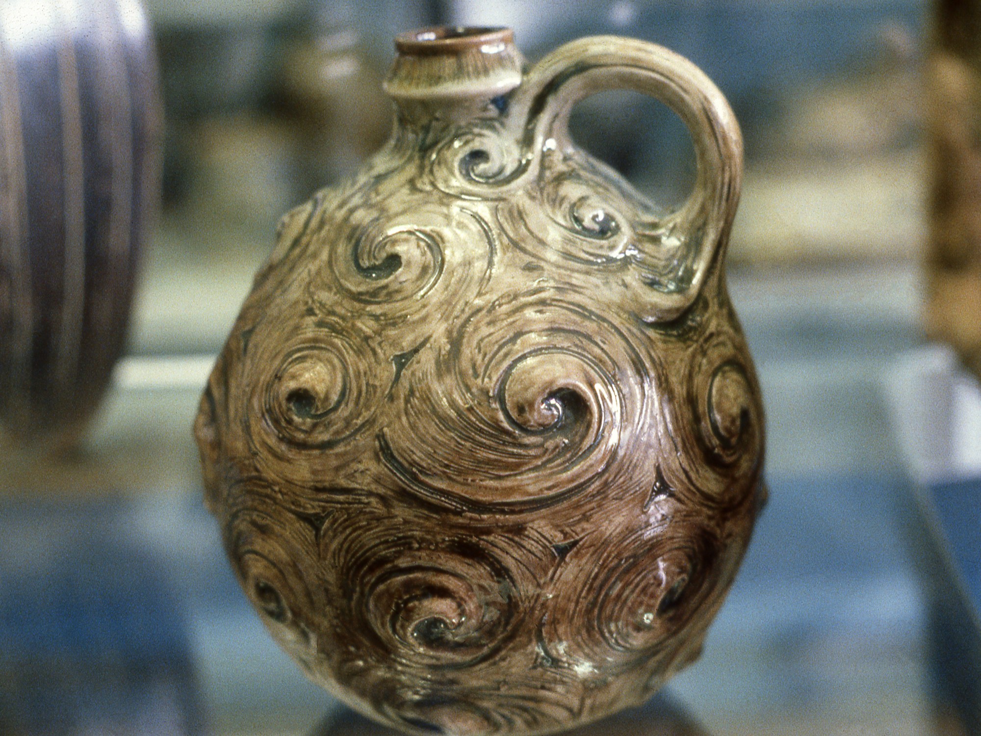 A lovely example of round jug decorated with very organic swirls in high relief that are reminiscent of clouds that appear in Chinese or Japanese prints or Islamic art or perhaps rolling waves – appropriate for the use of the jug as vessel for holding a liquid.